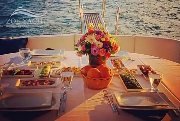 - I menù cena sono preparati esclusivamente per lo Zoe Yacht e offrono pesce fresco e una selezione di frutti di mare, carne e verdure, forniti da ristoranti rinomati e rinomati sul Bosforo (in base al periodo e alla località della crociera).